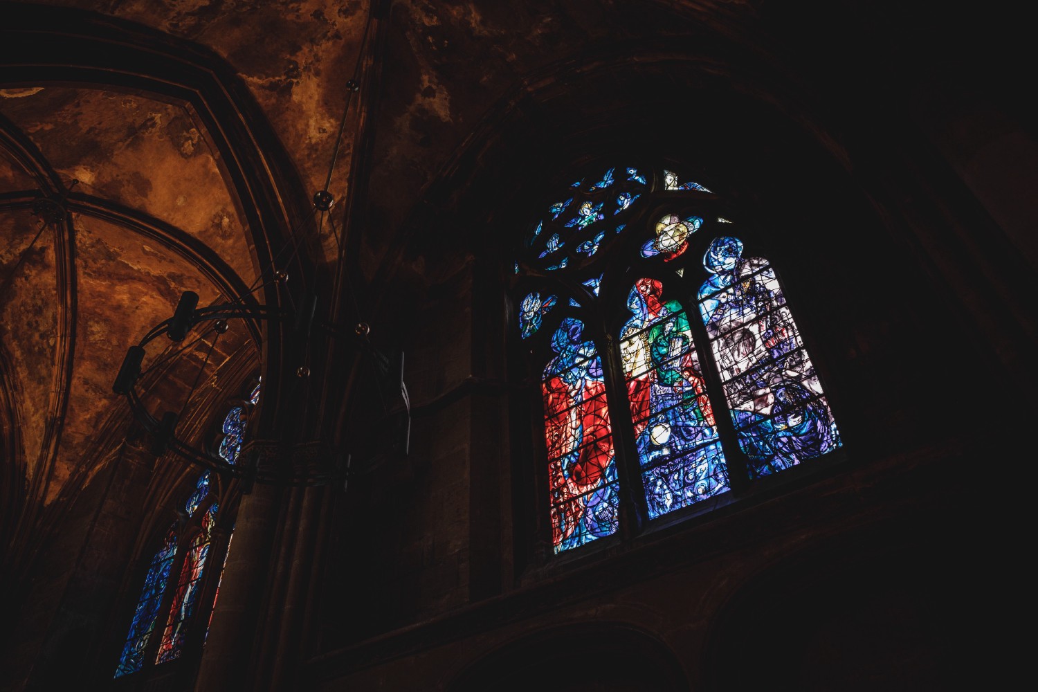 In 1959, Marc Chagall agreed to create two bays based on episodes from the Old Testament in the northern ambulatory of Metz Cathedral. One of them depicts Moses receiving the Ten Commandments, David playing the harp, and the crossing of the Red Sea by the Hebrews. Above, Jesus on the Cross wears a tefillin, a Jewish headgear. As usual, Chagall used crude colors to fill its stained-glass windows. As a Jewish artist realizing performances destined to everyone, he intended to spread a Judeo-universal language in his work. A stained-glass window depicting Eve he realized in 1963 was broken by burglars in 2008.