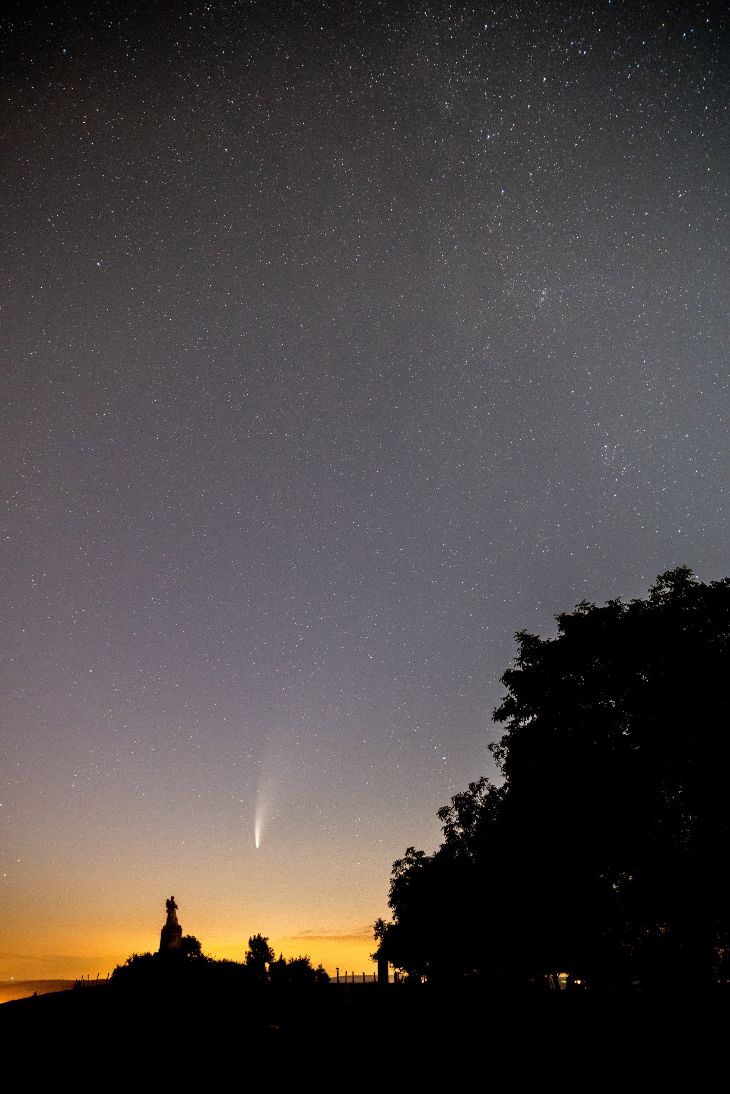 La colline du Léomont à l'aurore. On y voit le monument du Léomont, la comète Neowise (C/2020 F3 NEOWISE) et la Voie Lactée. (14/07/2020)