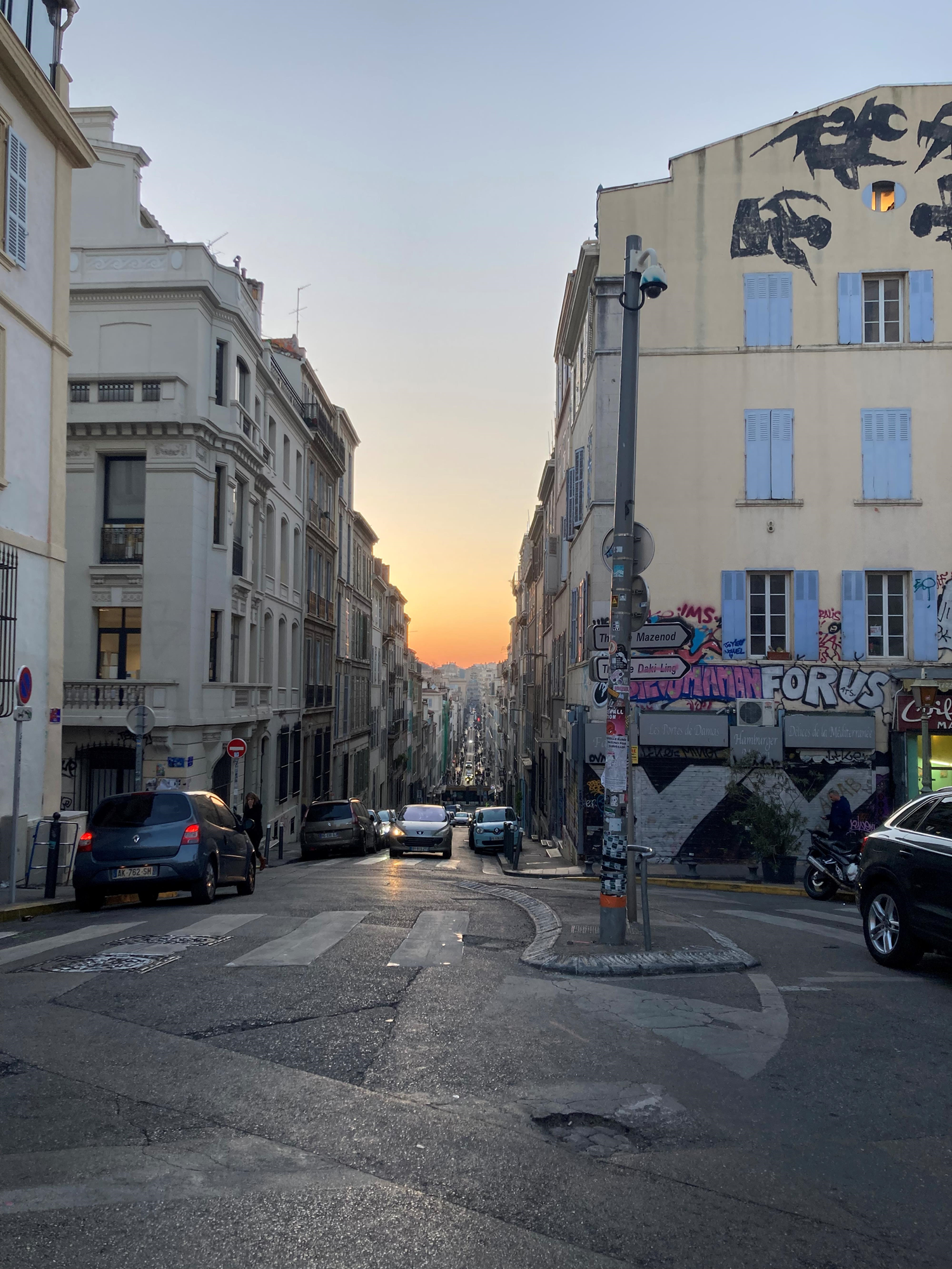 Vue du coucher de soleil depuis la rue Jean-Baptiste-Estelle dans le quartier de Noailles à Marseille, France