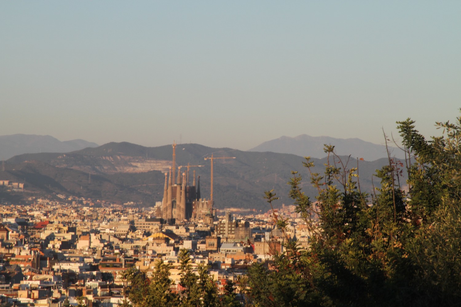 Vue sur la sagrada familia de barcelone à partir du musé d'art de catalogne en haut de montjuic.