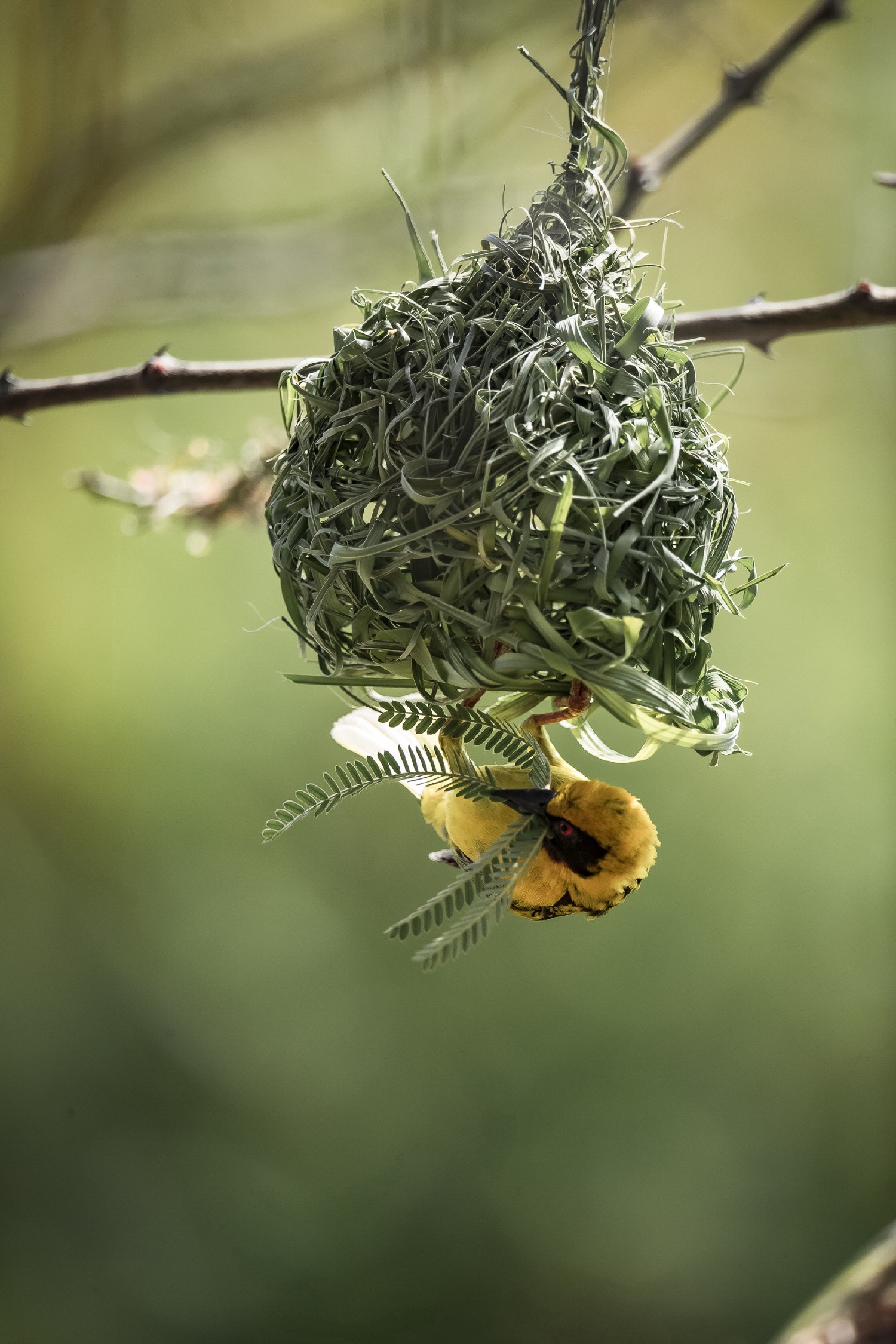 The weaver’s nest, oval ball-shaped, is hung at the end of the branch by one or two fasteners. The carrying branches are bare, which further increases the visibility of the colonies. The egg-laying chamber is lined with much smaller leaves, such as young leaves of acacias or tamarinds.
