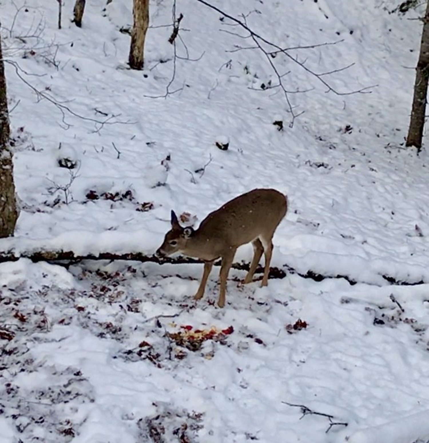 This doe was wandering the forest and the smell of the apples enticed the deer to come closer to have a snack.