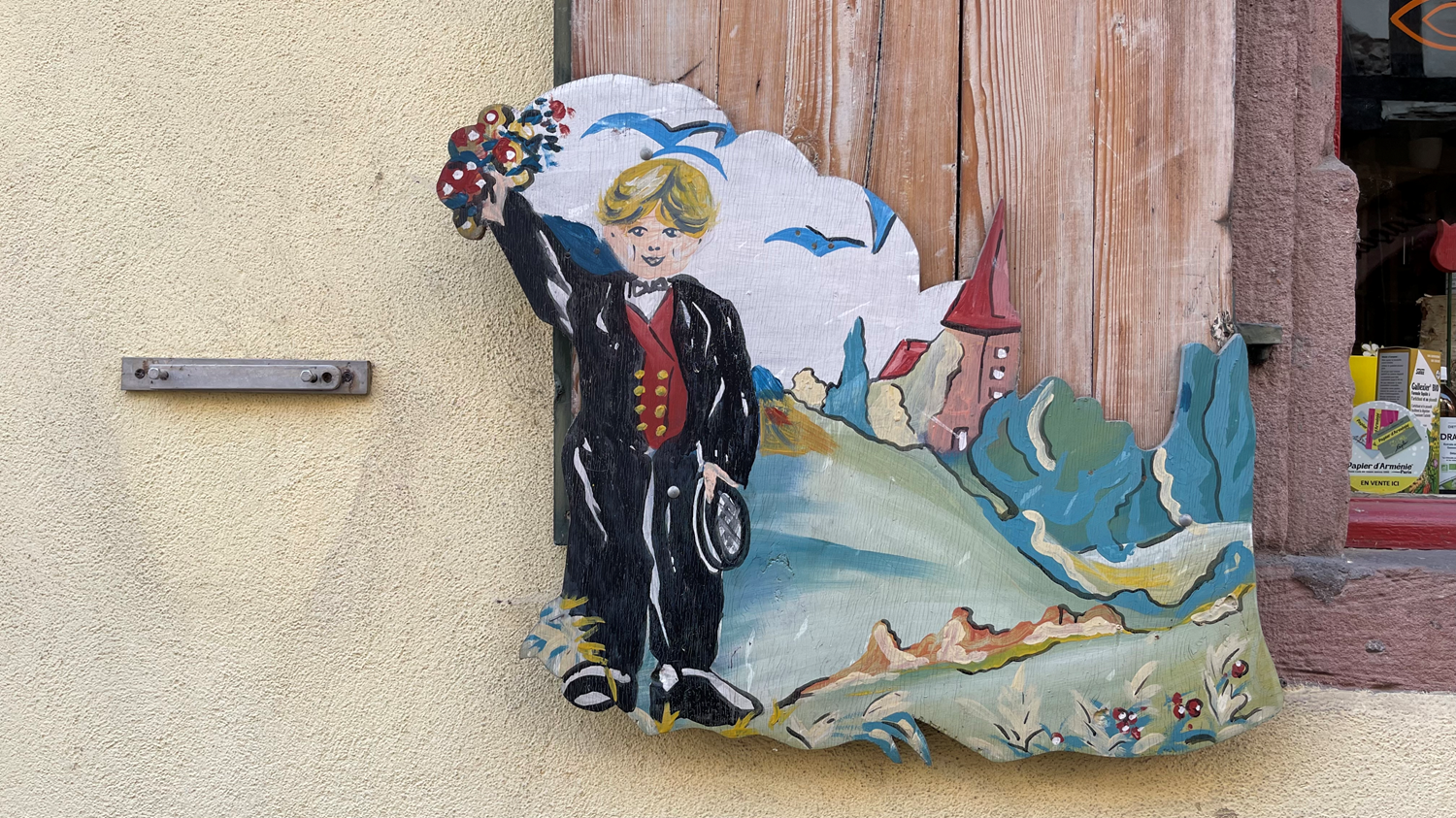 Kaysersberg ( Haut-Rhin ) . Arrêt de volet en bois superbement peint et décoré. Vive l’Alsace !