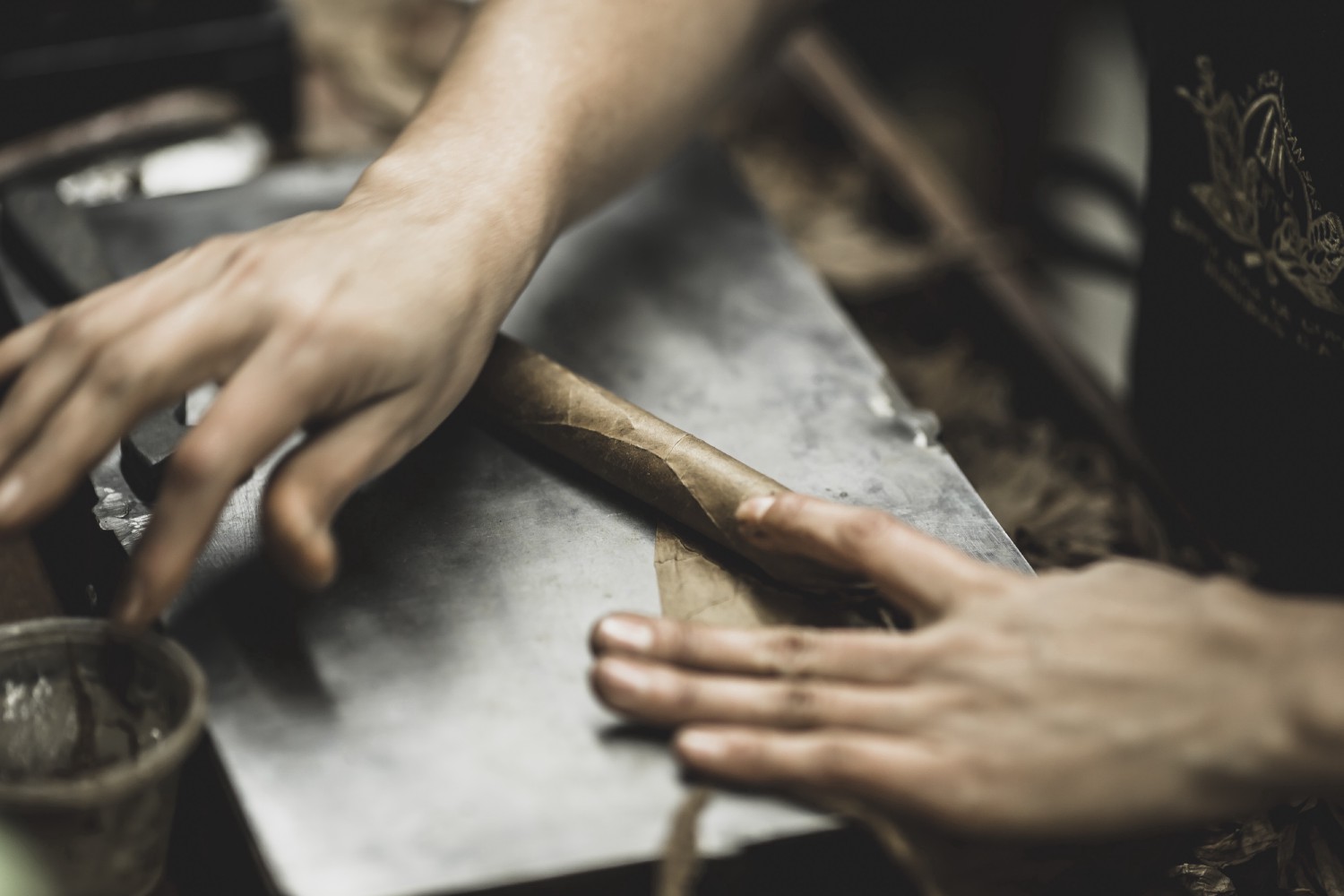 After removing the roll from the mold, the cigar roller cuts off the leaves protruding from the head and foot, before winding it in the wrapper leaf. This wrapper leaf is cut with a special half-moon shaped knife, called the chaveta, and is wrapped around the cigar.