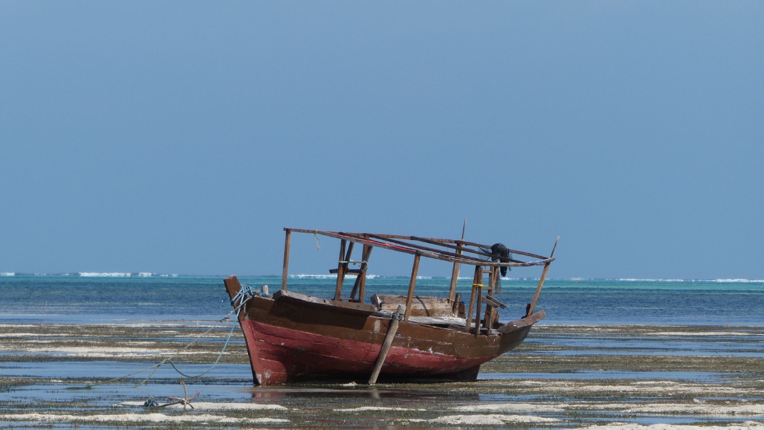 A home built wooden fisher boat is sitting on the sandy ground during low tide