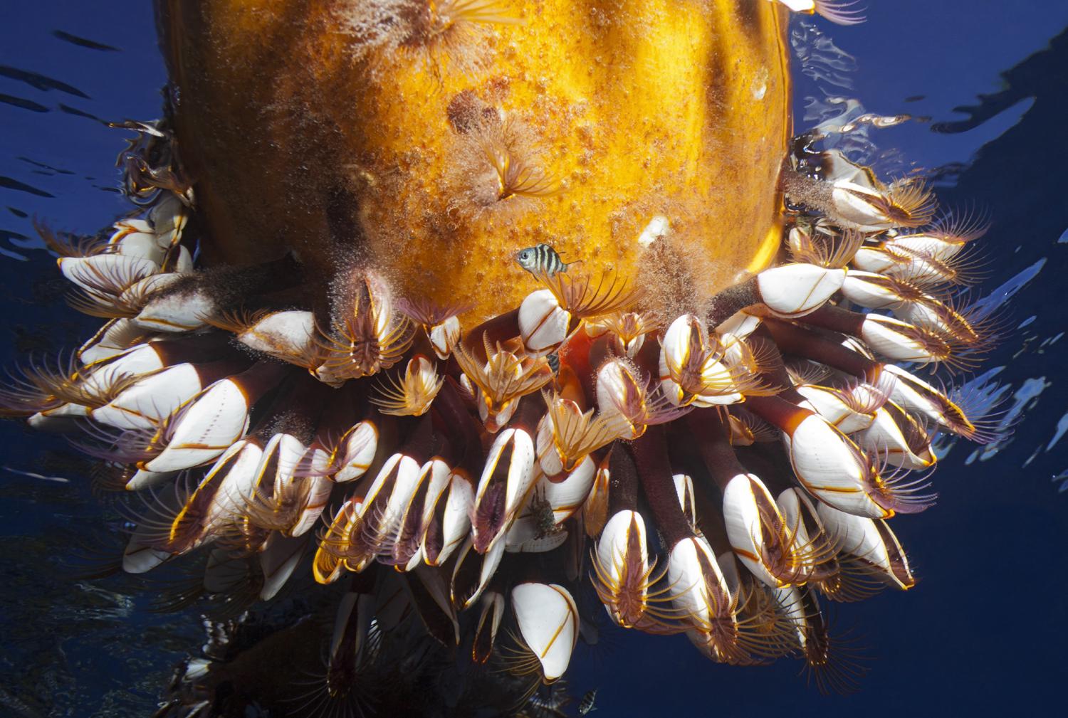 Drifting buoys hourly measure meteorological (atmospheric pressure, wind speed and direction, air temperature and humidity) and oceanographic (sea temperature ; wave period, height and direction) parameters and transmit the data by radio or satellite. They float on the surface and move with the winds and currents. Their submerged part offers a support for various concretions, algae, anemones which attract a whole marine life.