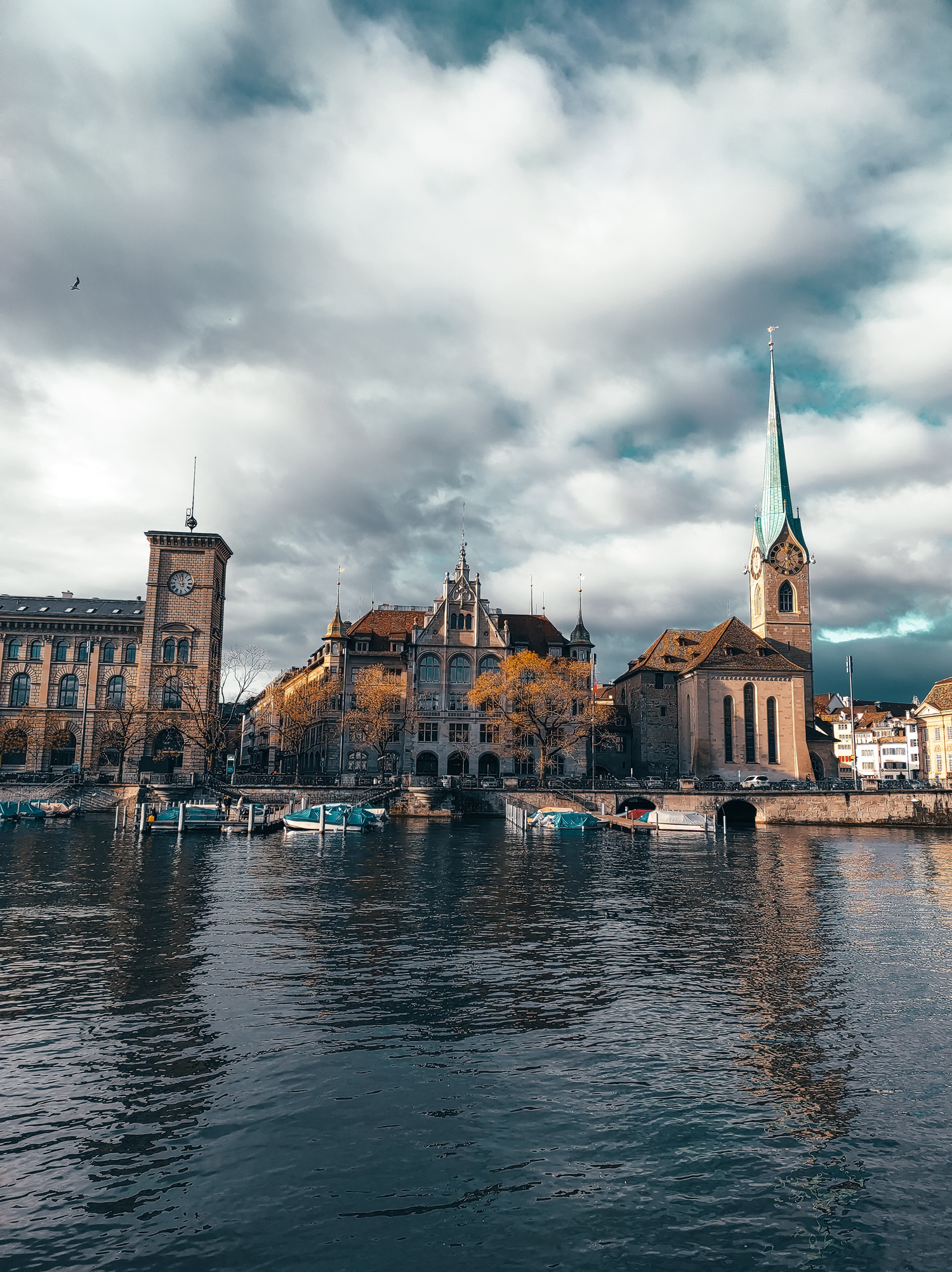 La jolie ville de Zürich, un matin d'hiver. Ici, la modernité de la ville s'accorde étrangement bien avec la nature environnante : les montagnes majestueuses se couvrent et se dévoilent en fonction de la météo. On prend le temps, on contemple, admiratif.