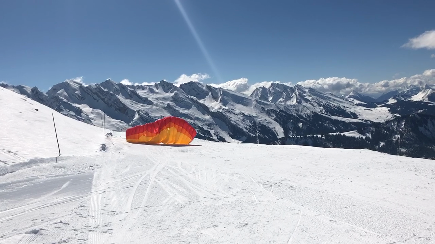 Un parapentiste s’élançant du sommet du Mont Lachat en direction de la station du Grand Bornand.